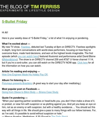 Every Friday, Tim Ferriss sends out a digest with the 5 coolest things he found or pondered upon in the previous week.